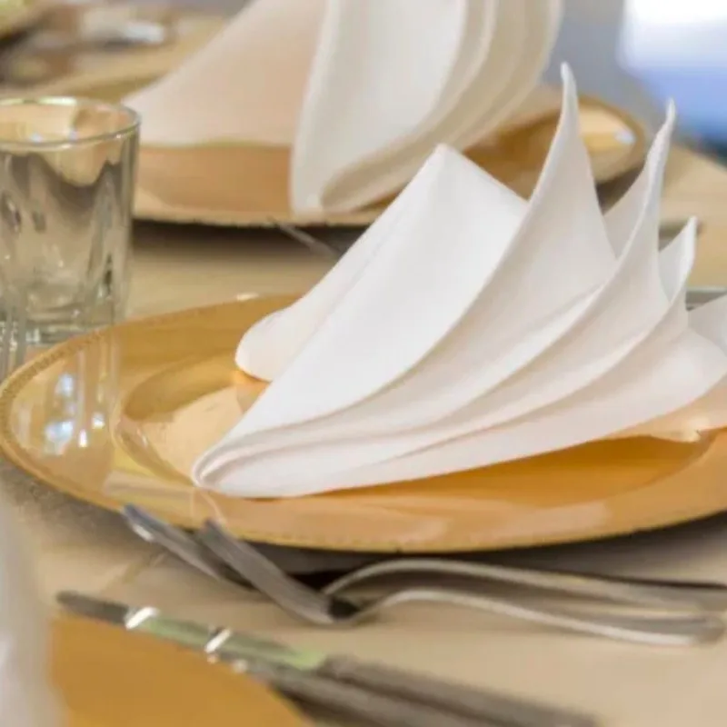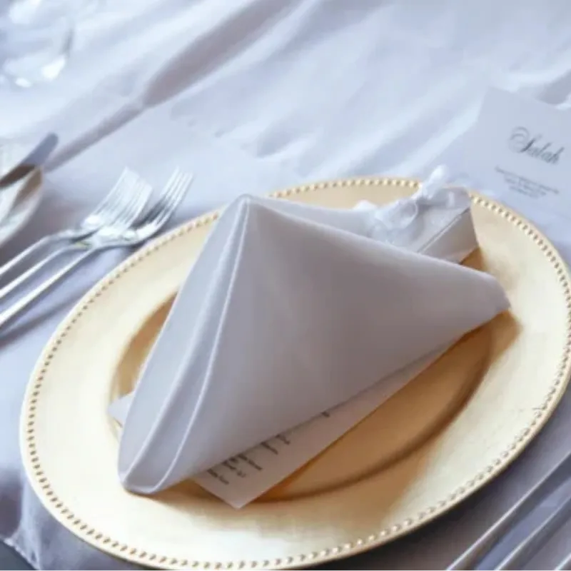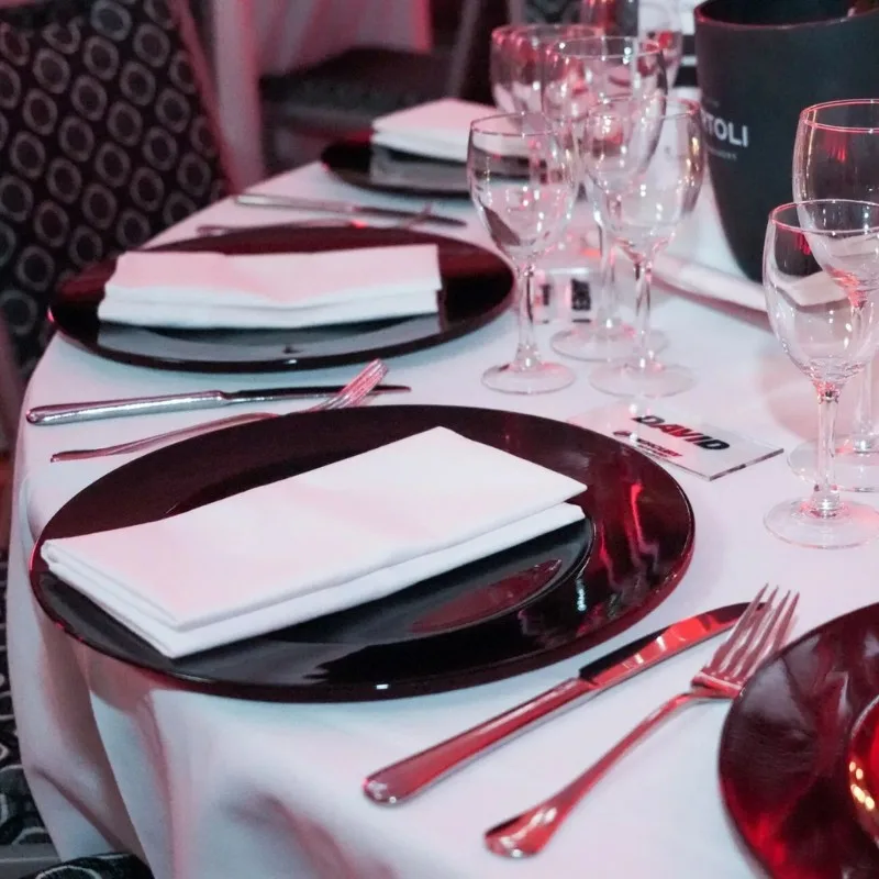 Available for hire, our charger plates are ready for collection, professionally cleaned, and prepared to ensure a seamless and stress-free event setup.